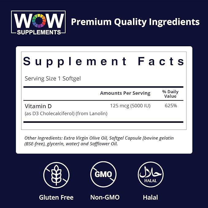 - ππππ πππ¦π’π₯π£π§ππ’π‘ ππ’π₯π π¨ππ: WOW Supplements uses liquid softgels to provide optimal absorption of Vit D 5000 IU. This premium Vit D3 5000 IU Softgels formula, which includes extra virgin olive oil and safflower oil, ensures that your body receives the optimum benefit from each dose.