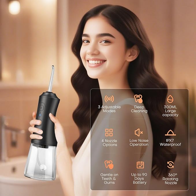 - 【Large 300ml Tank & Easy-Clean Design】The 300ml flosser tank is designed to meet the needs of a complete oral cleaning, eliminating the need for frequent refills and making your oral cleaning more convenient and efficient Keeping your water flosser clean is just as important as keeping mouth clean. Its detachable and wide-mouth design renders it easy to clean and refill, ensuring optimal hygiene.