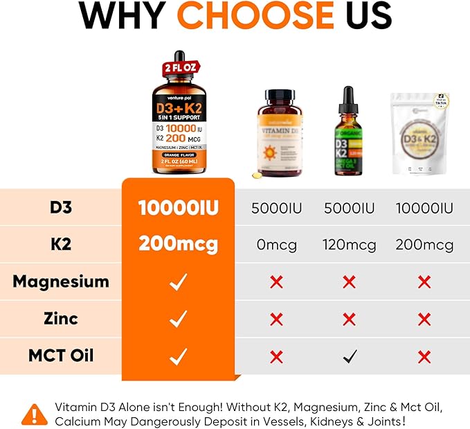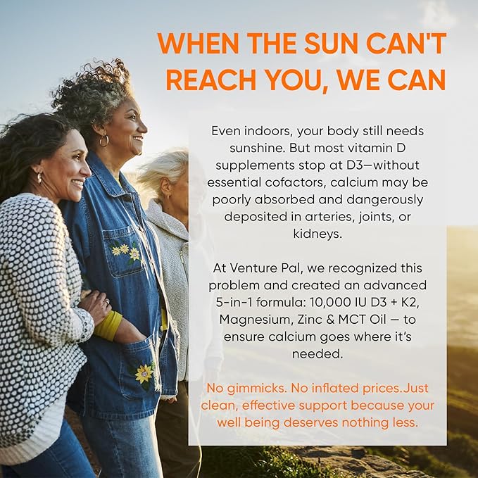 Venture Pal 5-in-1 Vitamin D3 10000 IU & K2 as MK-7 200mcg with Magnesium, MCT Oil, Zinc, Sugar-Free Vitamin D Liquid |Maximum Absorption for Bone, Mood & Immune Health - 2 FL OZ, 60 Days