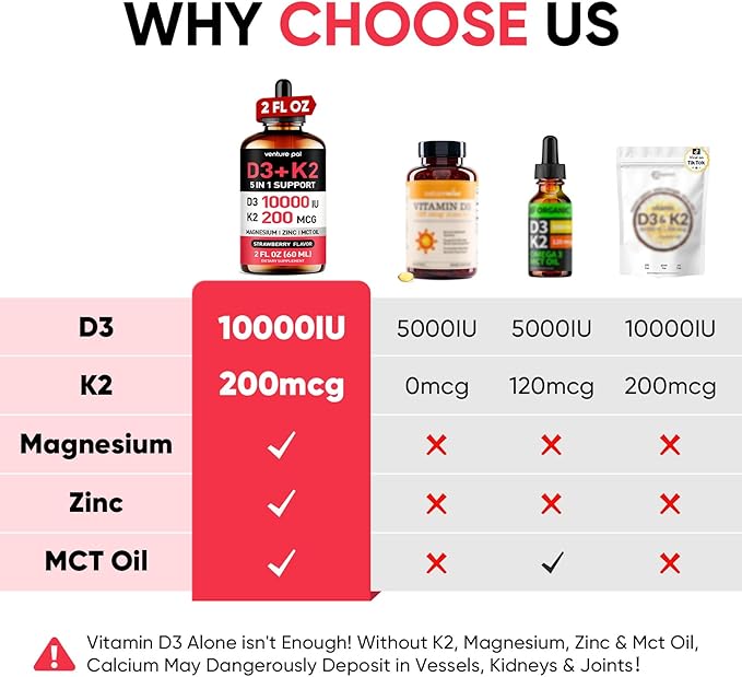 - STRONG BONES, STRONGER YOU: The perfect pairing of Vitamin D3 and K2 works wonders for bone health. D3 boosts calcium absorption, while K2 ensures it goes straight to your bones—not your arteries. This dynamic duo supports bone, teeth, and muscle health, delivering maxium benefits