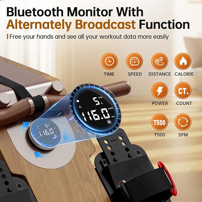 - 【Smart Bluetooth Monitoring System for Clear Data Insights】:Our water rowing machine seamlessly connects with your smartphone via Bluetooth, displaying your workout data in real-time, including time, speed, distance, and calorie consumption. The alternating broadcast function lets you easily grasp your data during exercise, enhancing workout efficiency and adding a sense of achievement to every row.