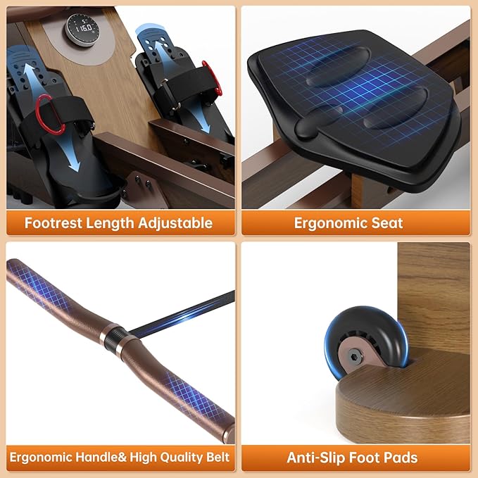 - 【Ergonomic Design for a Comfortable and Safe Workout】:We understand the importance of comfort and safety during exercise. This water rowing machine features adjustable footrests, an ergonomic seat and handle, and anti-slip designs to ensure users of all sizes can find their optimal rowing position, reducing the risk of injury and providing a safer, more comfortable workout experience.