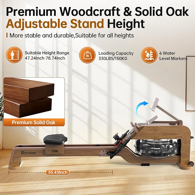 - 【Premium Solid Oak Craftsmanship for Durability】:Made from premium solid oak and robust materials, our water rowing machine not only looks elegant but also offers excellent stability and durability. The adjustable stand height design accommodates users of various heights, ensuring everyone can enjoy a customized workout experience.