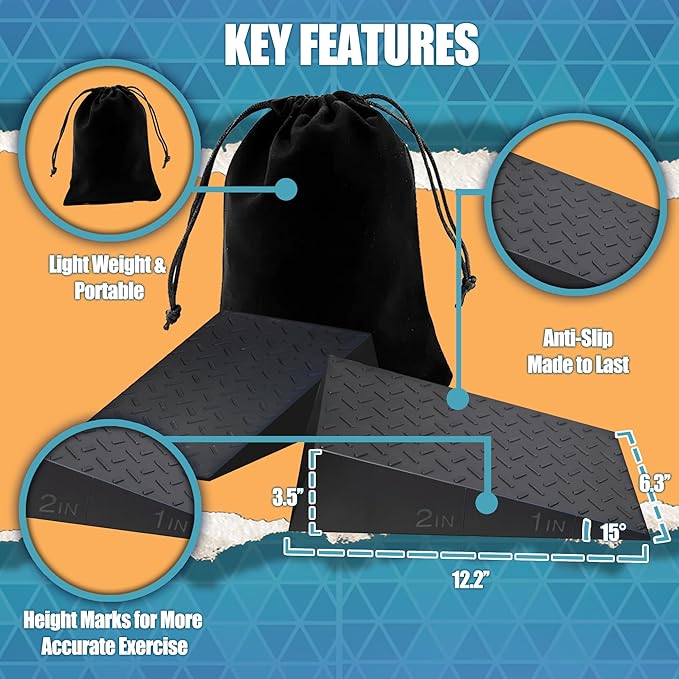- Essential Features: Made with a non-slip textured surface, the foot wedge ensures stability during heavy lifts. 2 Height Marks for more accurate workout. Its lightweight design allows for easy to carry, while its high weight capacity supports intense training sessions. Plus, it comes with a carry bag for convenience