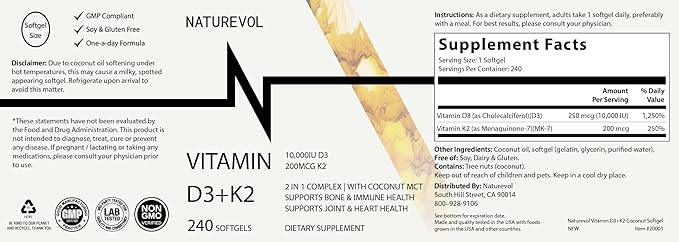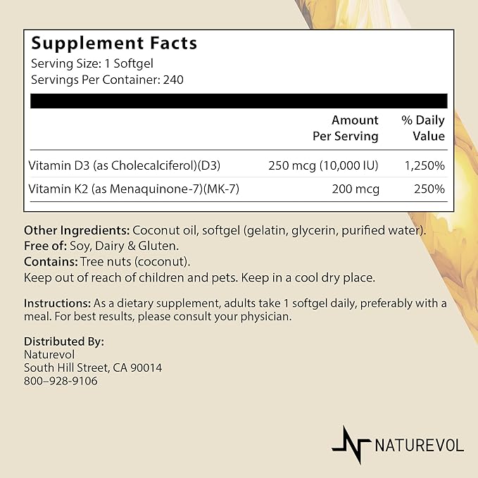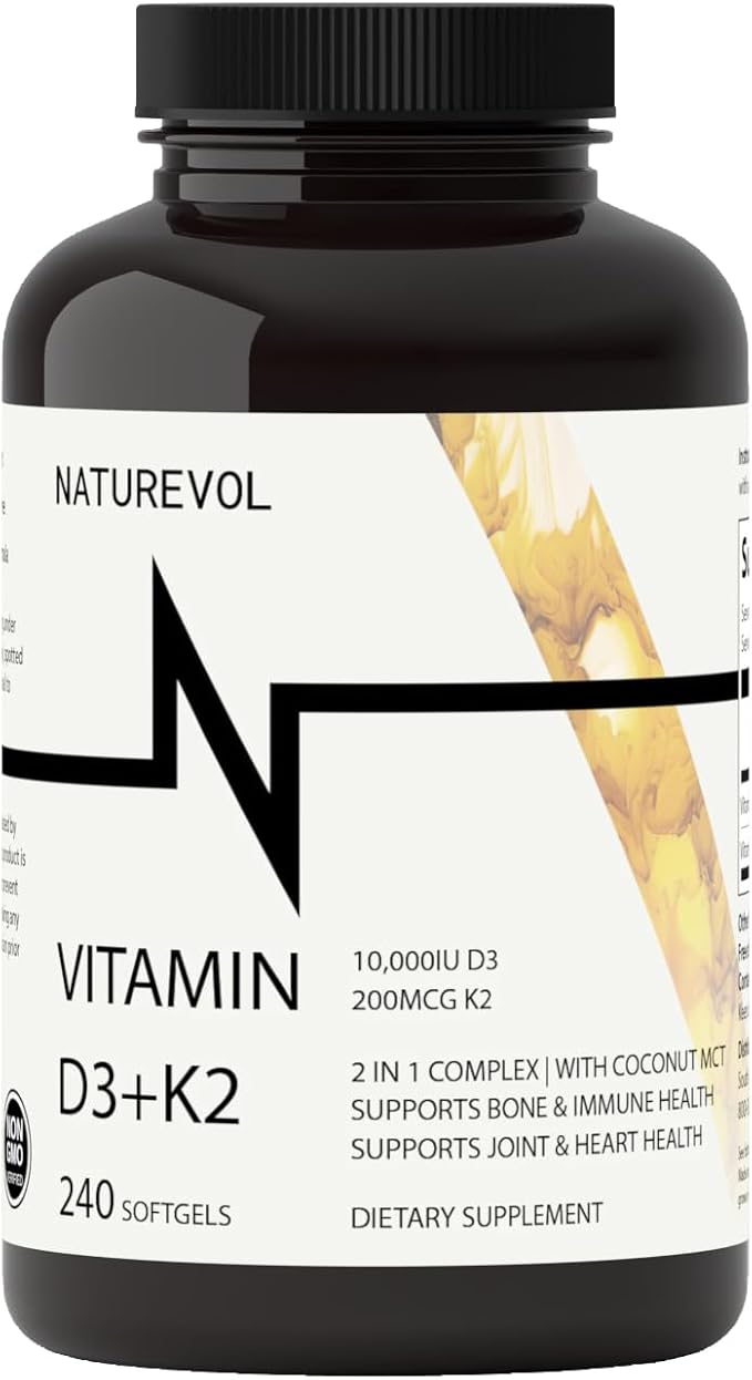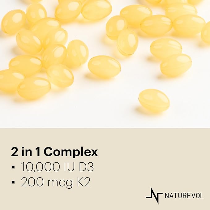 - Extra Strength Formula: Naturevol 2 in 1 Vitamin D3 + K2 with Coconut oil softgels contain 10,000iu D3, 200mcg K2(MK-7) and 300 virgin coconut oil. Formulated for optimal bioavailability, our softgels are designed for easy absorption, ensuring your body effectively utilizes every nutrient for enhanced health benefits.