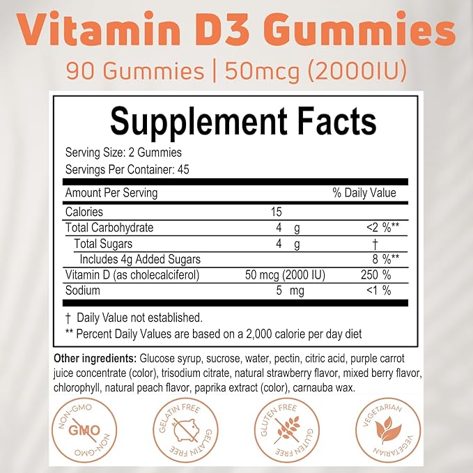 - Made with premium ingredients, these Vitamin D3 gummies are vegetarian, gelatin-free, and free of GMOs, gluten, dairy, and artificial colors or flavors—just pure, clean nutrition.