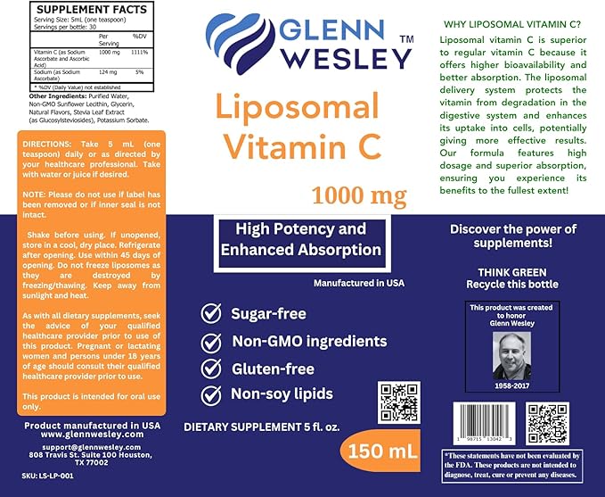 Liquid Liposomal Vitamin C 1000mg (5 Fl. Oz. 150ml) 30 Servings - Sugar-Free, Non-GMO, Gluten-Free Dietary Supplement - High Potency and Enhanced Absorption
