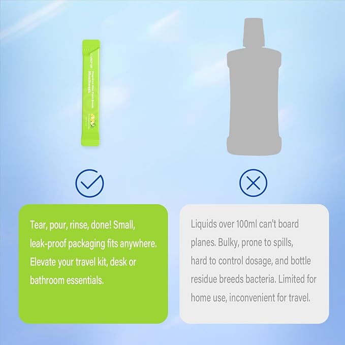 - High Use Count: Each pack contains individual mouthwash packets, each designed for one-time use. This bulk pack offers excellent value for frequent travelers and those always on the go.