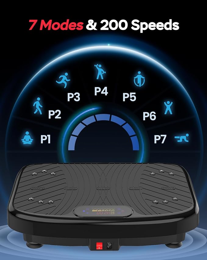 - Tailored Full-Body Workouts: With 200 adjustable speed levels and 7 automatic modes, this vibration plate adapts to your fitness needs, from gentle recovery to intense muscle activation. Perfect for users craving customized workout equipment at home, it eliminates the frustration of inflexible exercise routines, supporting diverse goals like toning or flexibility.