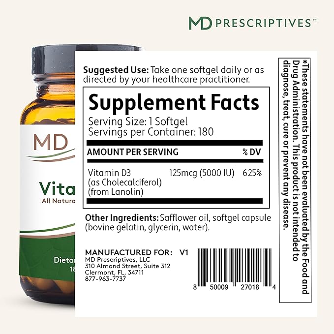 Vitamin D3 180 Gelcaps - Maximum Absorption for Strong Bones, Muscle & Immune Support, Non GMO Vegetarian Softgels, 125 mcg (5,000 IU)