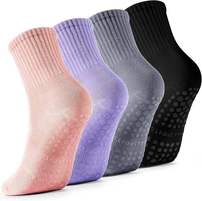 4 Pairs Pilates Socks with Grips for Women, Barre Yoga Grippy Socks, Womens Non Slip Pilates Crew Sticky Socks