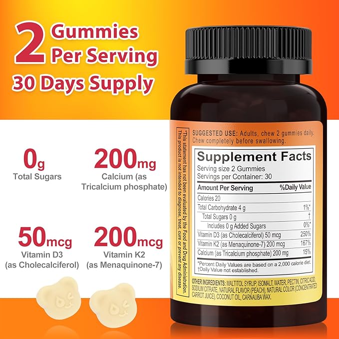 - Supports Bone Health: Our Natural Vitamin D3 K2 Gummies are specially formulated with 2000 IU of Vitamin D3, 200 mcg of Vitamin K2, and 200 mg of Calcium to promote healthy bones. This powerful combination enhances calcium absorption and supports bone density.