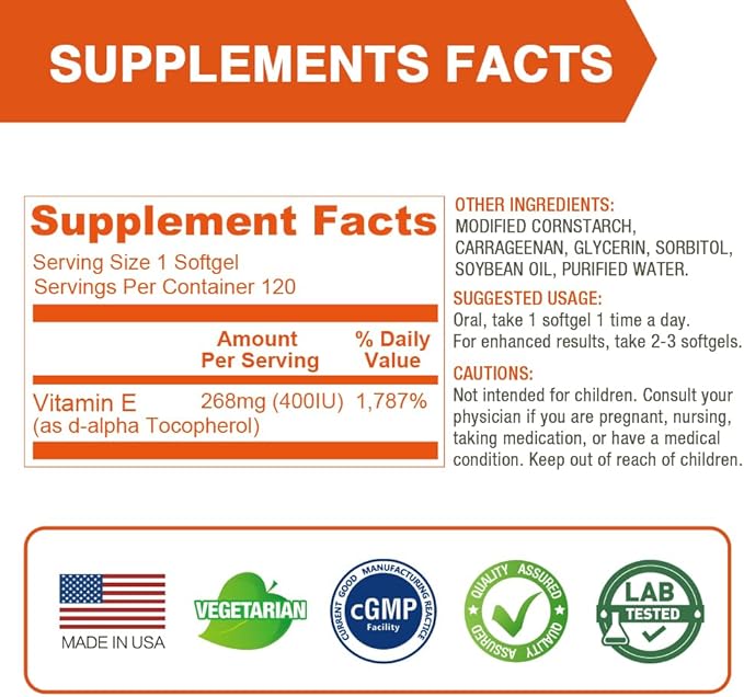 - 【NATURAL VITAMIN E】- Our Vitamin E Softgels offers 400 IU of Vitamin E as d-alpha tocopherol in every softgel and has higher bioavailability to the body.