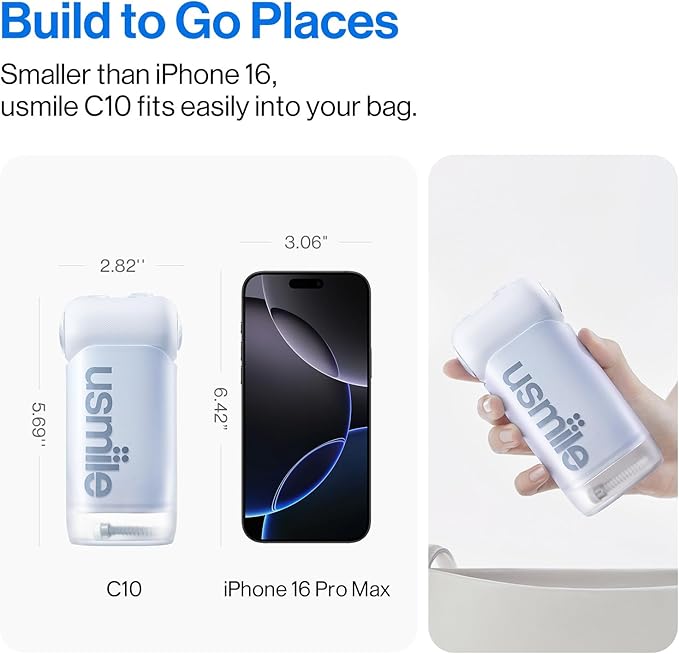 - ✅ Ultra-Portable & Travel-Friendly: The usmile C10 is lightweight and collapsible, perfect for travel, business trips, or everyday use. With up to 95 days of battery life and convenient charging via the included cable, it’s easy to keep your oral care routine going wherever you are.