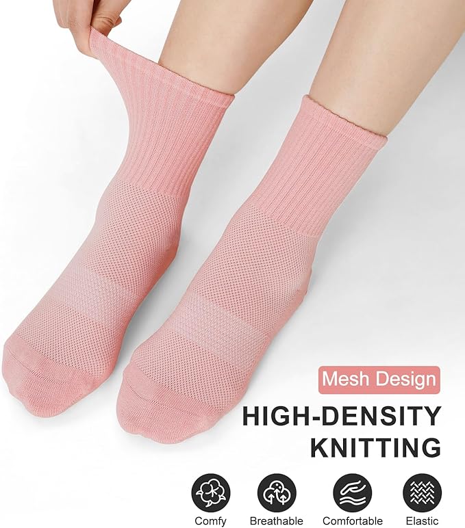 - [Comfortable Fabric & Ventilation Mesh] - Made of 92% cotton and 8% spandex, our grip socks are ultra soft, comfortable, and full of elasticity, feel like a second skin. The instep of yoga socks has two breathable net areas, which can dissipate heat and ventilation well, quickly discharge your sweat and keep your feet dry, so that your feet can feel cool and comfortable, not too stuffy or hot, whether in daily activities or in the process of exercise.