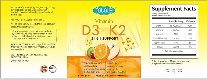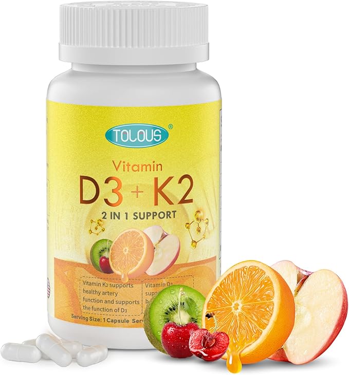 - 2 in 1 Support:TOLOUS vitamin D3 with K2 supplement, provides 5,000IU vitamin D3 and vitamin K2 125mcg (MK7) in a 1 capsule. It also includes a unique blend of Vitamin B2, B9 and Magnesium