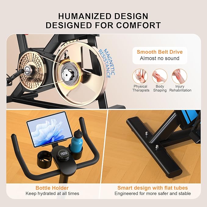 - Track Progress & Stay Entertained: The upgraded LCD monitor displays real-time stats like time, speed, distance, and calories to help you stay focused on your fitness goals. A built-in tablet holder lets you watch videos or listen to music as you ride—making your workouts more engaging and connected.