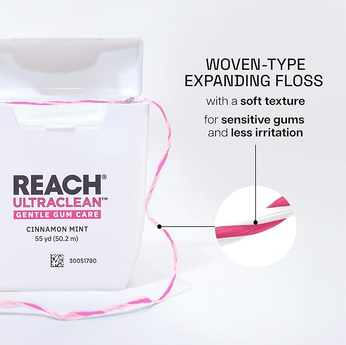 REACH ULTRACLEAN Gentle Gum Care Expanding Floss – Woven, Non-Waxed, PFAS-Free with Vitamin E, for Sensitive Gums, Cinnamon Mint 55YD (3-Pack)