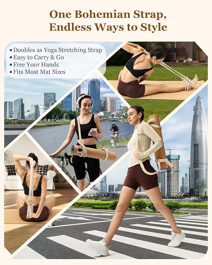 - 【BREATHABLE & SKIN-FRIENDLY DESIGN】Designed for ultimate comfort, our bohemian yoga carrying strap features a unique open-mesh weave—each thread incorporates micro-perforated eyelets for enhanced airflow. This innovative design ensures all-day comfort, offering a hypoallergenic, odor-free, and stretchable experience that prevents chafing, even against bare skin. The ultra-soft texture adapts seamlessly to your body, making it ideal for daily yoga commutes, gym sessions or outdoor workouts.