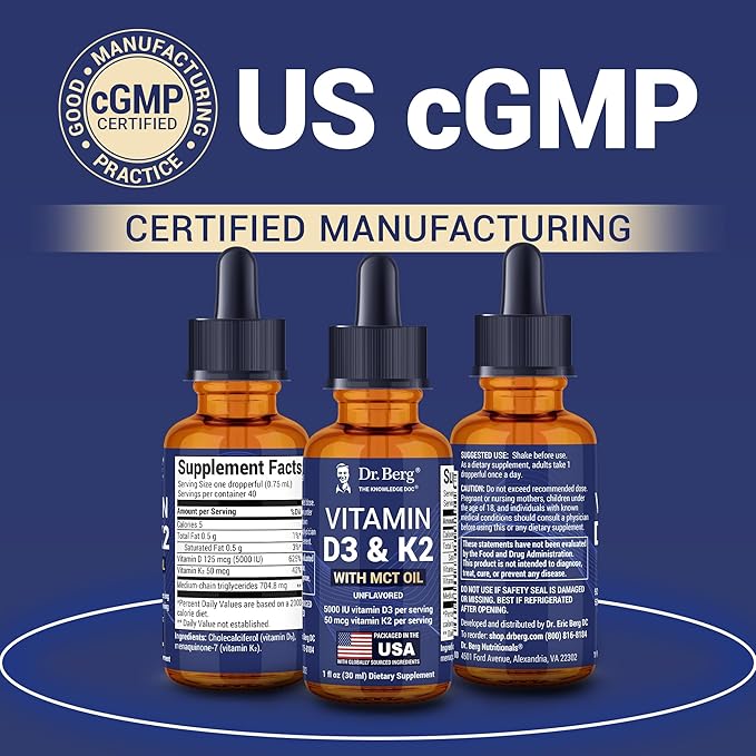 Dr. Berg Maximum Strength Vitamin D3 K2 Liquid Drops with MCT Oil – 5,000 IU Liquid Vitamin D3 with K2 – Supports Strong Bones, Heart, Energy, Immunity, and Overall Vitality* - Unflavored 1 Fl Oz