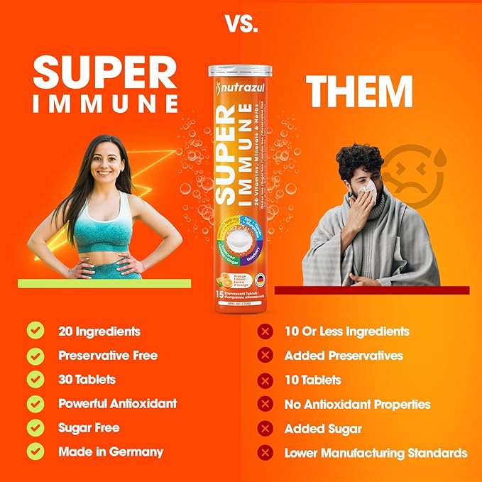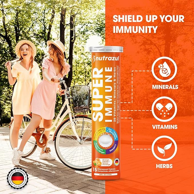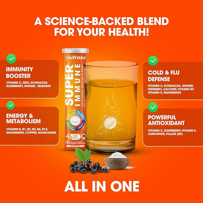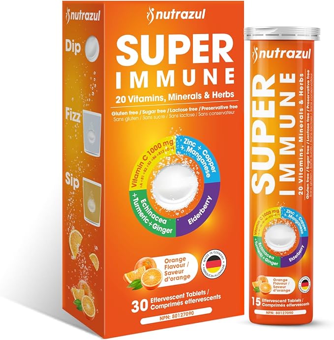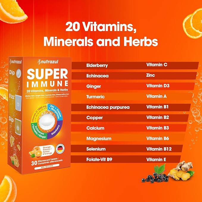 nutrazul Super Immune Effervescent Tablets | Maintains Immune Function & Antioxidant Support | 20 Vitamins, Minerals and Herbs | Orange Flavour | 30 Tablets