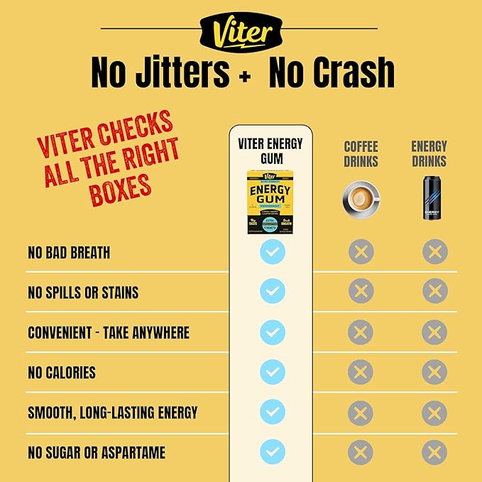 - Focus and Performance in Your Pocket - Made to enhance mental clarity and boost physical performance, have a piece of gum for a little boost, and take a second piece if you need a stronger longer lasting energy booster. Great for demanding cognitive tasks where you need your full focus, attention, and memory, Viter Energy Gum is a convenient and great tasting way to stay productive and on point when you need to be sharp, effective, and functional.