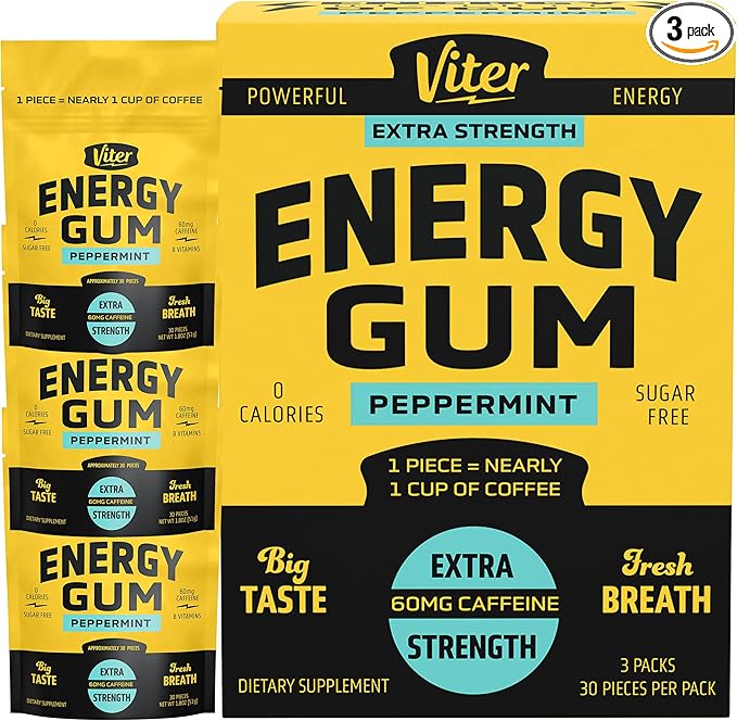- Energy and Alertness Immediately - Viter Energy Gum helps you stay alert, energized, and focused anytime on-the-go wherever life takes you. The resealable bag of 30 pieces of gum is small enough to fit in your pocket, bag, car, or office desk so you can grab a piece of great tasting on demand energy anywhere you need it. Perfect for travel, work, out with friends, exercise and workouts, or whenever you need a caffeine kick to give you a boost without any spills, mess, or jitters.