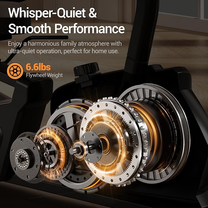 - 16 LEVEL MAGNETIC RESISTANCE: The precisely engineered 6.6 lb flywheel, paired with a magnetic control system, delivers 16 levels of resistance for even the most challenging workouts. Crafted from high-carbon steel with an engineered structure, this exercise bike offers exceptional durability and stability. The belt-driven system ensures a smooth, whisper-quiet operation, perfect for home environments without disturbing others.