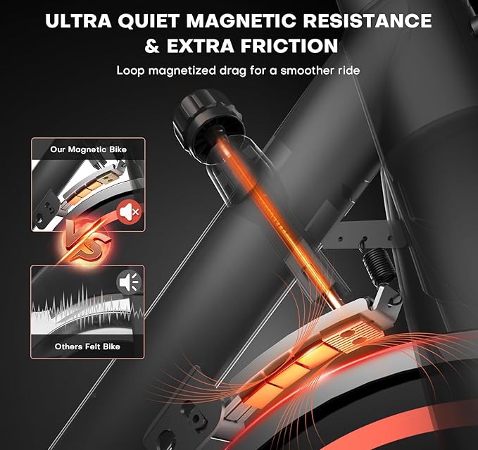 - [Magnetic Resistance, Quiet & Smooth]: Equipped with the latest magnetic resistance system, our stationary bikes for home offers precise adjustments and even stable friction for smoother riding. Unlike traditional wool felt resistance, this magnetic system requires no brake pad replacements and produces no friction noise. Combined with a maintenance-free belt drive controlling the sound at 25dB, more silent during exercise, ideal for home or office use without disturbing others