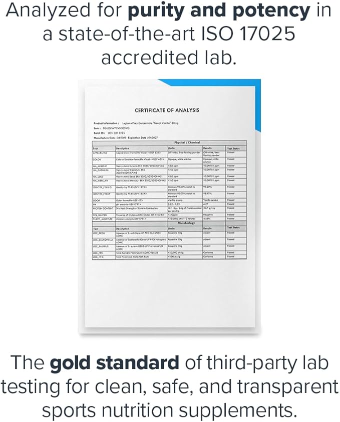 - Scientifically Tested Protein Supplements: Each batch of LEGION Whey Protein undergoes comprehensive third-party testing in an ISO 17025-accredited laboratory, ensuring strict adherence to safety and quality standards. This rigorous validation guarantees the absence of contaminants, banned substances, and confirms the protein content exactly matches the label, giving you complete confidence in every serving of this premium whey protein powder.