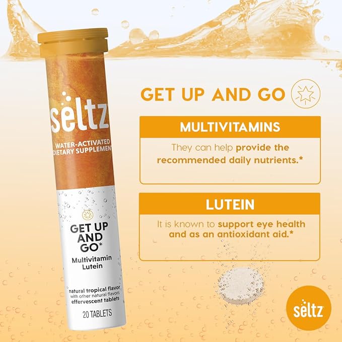 Seltz® Water-Activated Vitamins - Get Up and Go with Multivitamin and Lutein – Natural Tropical Flavor Dietary Supplement - 1 Pack x 20 Effervescent Tablets
