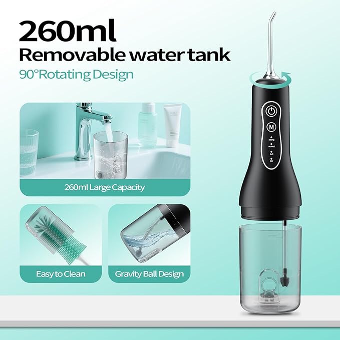 - 4 Adjustable Modes, 260ml Large Capacity Tank: This water flossers for teeth offers four cleaning modes: Powerful, Standard, Gentle, and DIY. Choose the mode that best suits your oral condition and needs for personalized oral care. Equipped with an upgraded 260ml large-capacity tank, it eliminates frequent refills, enhancing cleaning efficiency and comfort. The removable design makes tank cleaning more convenient.