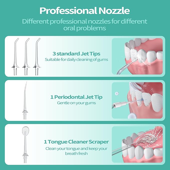 - IPX7 Waterproof Rating with 5 Replaceable Nozzles: Boasting an IPX7 waterproof rating, this flosser ensures the charging port cover is securely closed for safe use even in the shower. The water dental picks for teeth cleaning and flossing comes with 5 interchangeable nozzles that rotate 360° for effortless cleaning of every corner of your mouth. Choose the nozzle that best suits your oral condition and cleaning needs.
