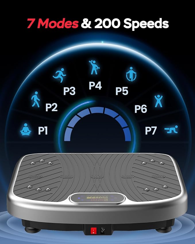 - Tailored Workout Flexibility: Offering 200 vibration levels and 7 automatic modes, this Vibration Plate Exercise Machine suits beginners to advanced users for muscle toning or recovery. Perfect for customized fitness routines at home, it addresses the struggle of finding versatile vibration plate solutions for diverse fitness goals.