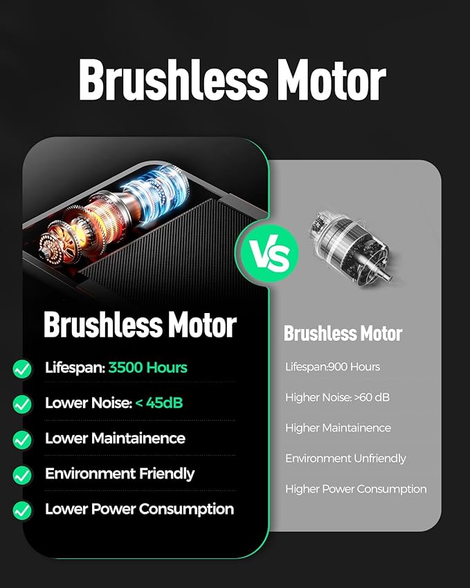 - 【UPDATE QUIET BRUSHLESS MOTOR】Treadmill with brushless motor can reduce noise more efficiently than ordinary brush motor, the maximum speed is 8.5MPH, 3.0HP power consumption is less, energy saving and environmentally friendly, noise level is controlled at less than 45dB, effectively providing a quiet and comfortable exercise and fitness environment.