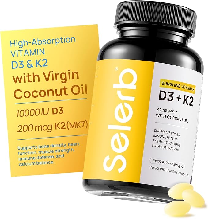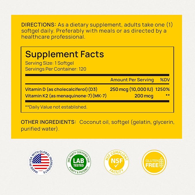 - Synergistic vitamin D3 + K2 Formula: Our high-strength blend combines vitamin D3 10000iu (cholecalciferol) and 200 mcg of MK-7 Vitamin K2 to support calcium absorption, bone strength, heart function, and immune defense. D3 vitamin enhances calcium uptake, while K2 helps guide it to your bones—where it belongs.