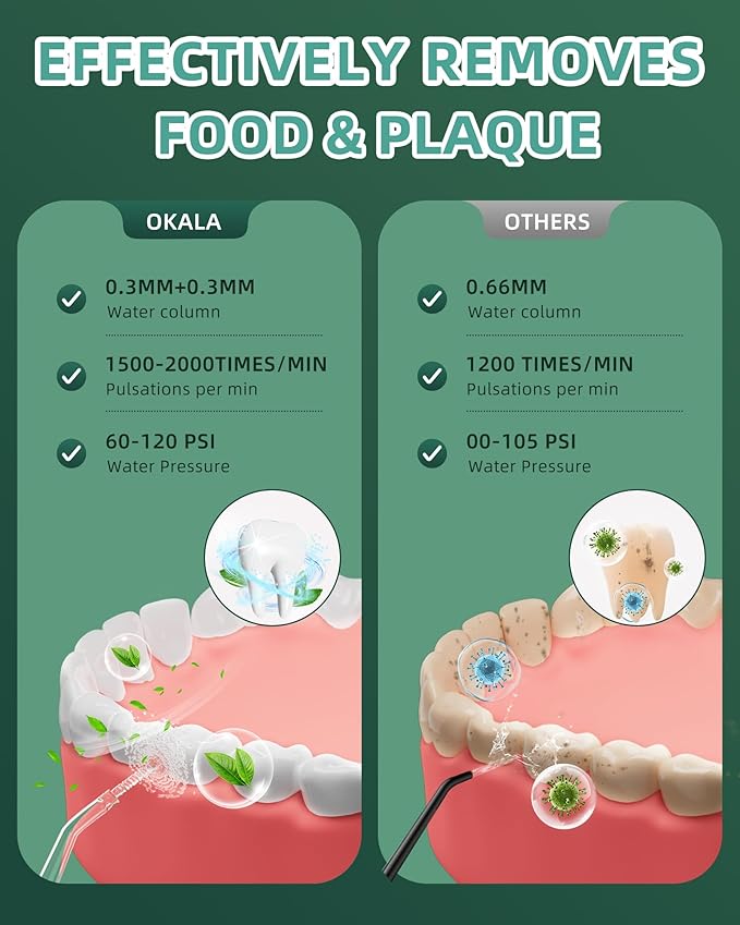 - 【Deep Clean, Fresh Breath, Gum Protection】The OKALA power water flosser has advanced 0.6mm high-performance pulse technology with 1500-2000 pulses per minute and 60-120 psi water pressure.Unmatched Deep Cleaning-removes 99.99% of food debris and plaque, for promoting gum health, fresh breath, and bright smiles: Say goodbye to ordinary water dental flossers that leave food particles behind.