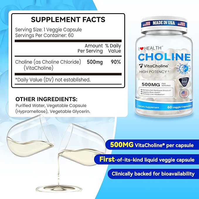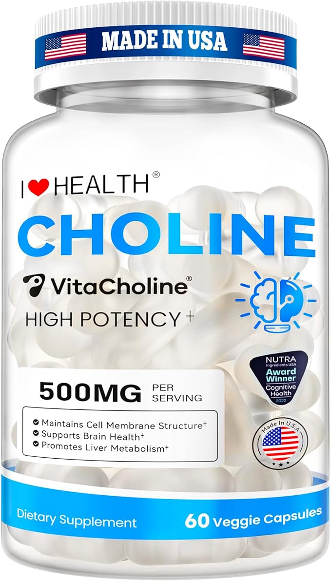 Award Winner -Clinically Dosed 500mg VitaCholine ® - 60 Caps - Liquid Choline Supplement –Support Pregnancy & Baby Brain & Liver Health LDL & HDL Level - Cognitive Health - Made in USA