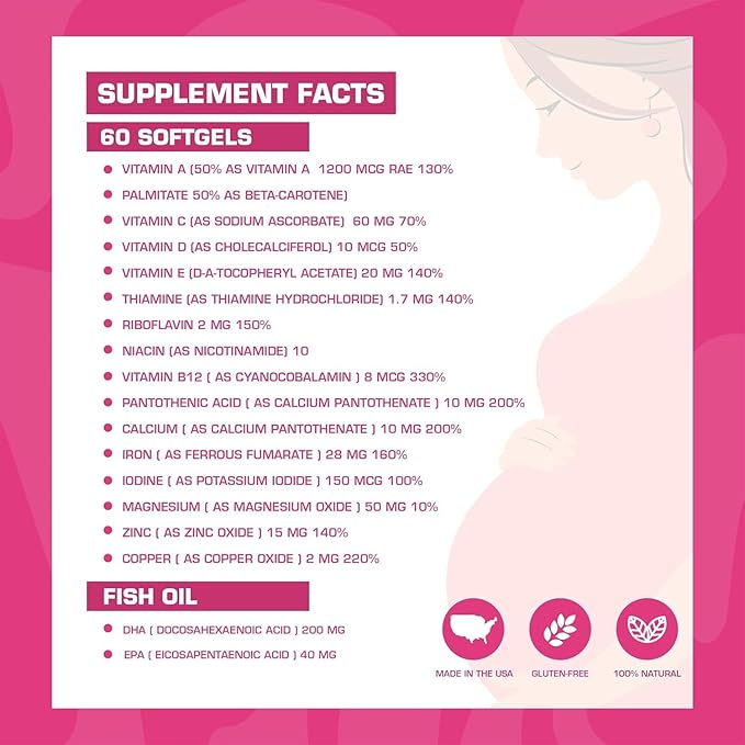 - Essential Ingredients for baby & mom support: Folic acid, Omega 3 DHA/EPA, Vitamin A, B6, Vitamin B12, C, D3, E & Minerals: Calcium, Iron, Magnesium, Zinc supplement for women